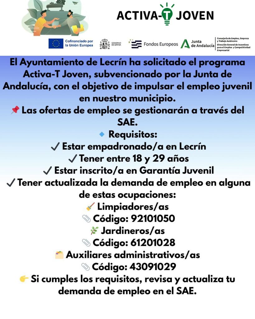 El Ayuntamiento de Lecrín ha solicitado el programa Activa-T Joven, subvencionado por la Junta de Andalucía, para promover el empleo en Lecrín de jóvenes. Dichas ofertas se realizarán desde el SAE.