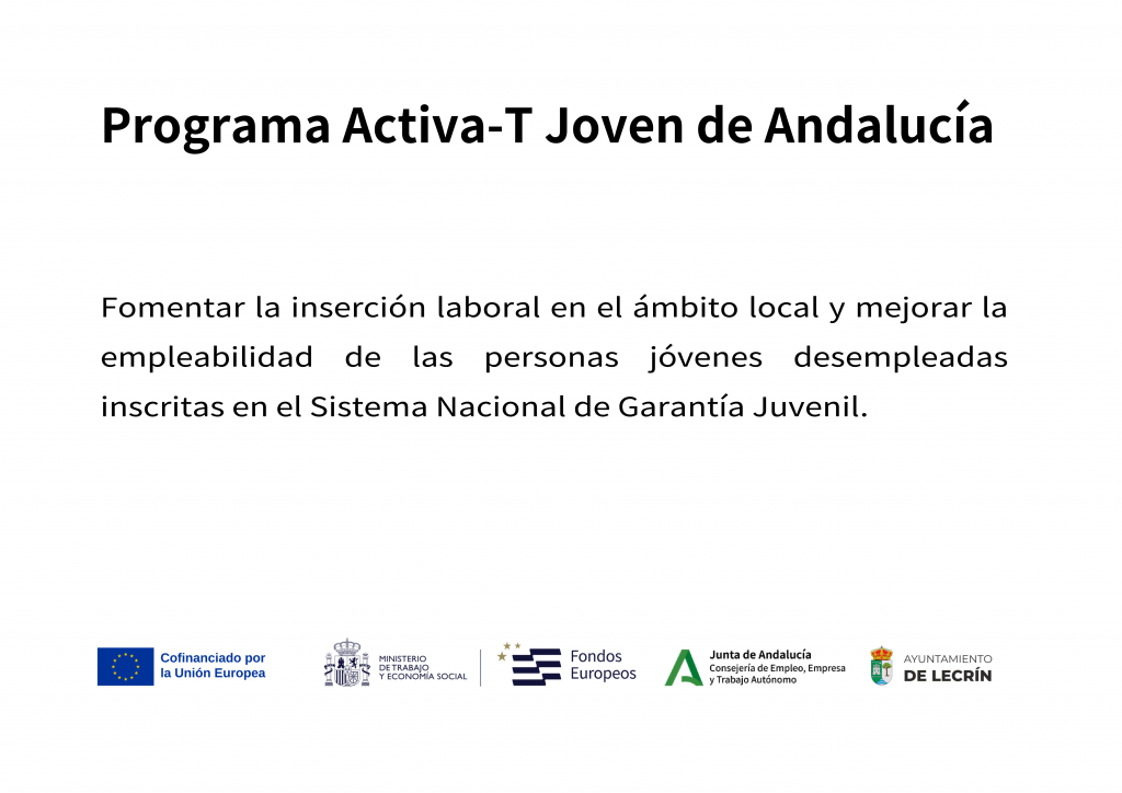 El Ayuntamiento de Lecrín ha recibido una subvención de la Consejería de Empleo, Empresa y Trabajo Autónomo de la Junta de Andalucía, financiada por la Unión Europea con cargo al Programa FSE+ Andalucía 2021-2027, enmarcada en el Programa Activa-T Joven para fomentar la inserción laboral en el ámbito local y mejorar la empleabilidad de las personas jóvenes desempleadas inscritas en el Sistema Nacional de Garantía Juvenil, que asciende a 89.200€.