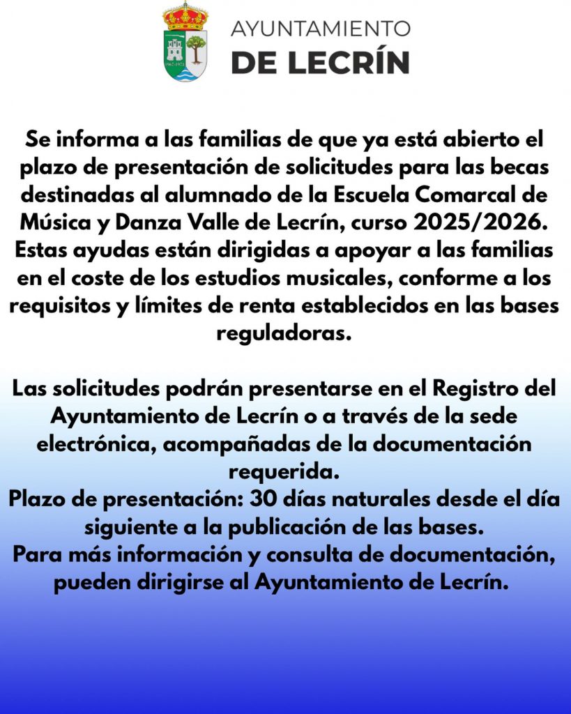 Se informa a las familias de que ya está abierto el plazo de presentación de solicitudes para las becas destinadas al alumnado de la Escuela Comarcal de Música y Danza Valle de Lecrín, curso 2025/2026.