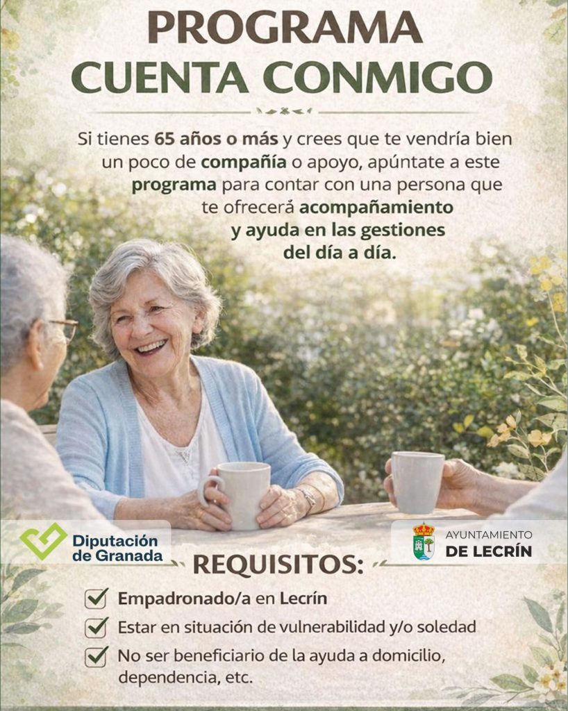 Si tienes 65 años o más y te encuentras en situación de soledad no deseada o vulnerabilidad, desde el Ayuntamiento ponemos en marcha el programa “Cuenta Conmigo”, impulsado por la concejalía de Servicios Sociales, Ciudadanía y Tercera Edad, en colaboración con la Excma. Diputación Provincial de Granada.